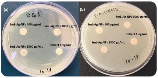 Antimicrobial assay of SmL-Ag-NPs against (a) Escherichia coli and (b) Staphylococcus aureus bacteria.