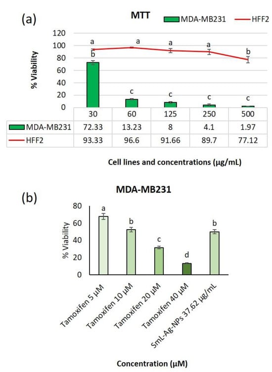 (a) Cytotoxicity of SmL-Ag-NPs on proliferation MDA-MB231 and HFF2 cells; (b) growth inhibition of MDA-MB231 cells by tamoxifen (5, 10, 20 and 40 µM) compared with SmL-Ag-NPs (37.62 μg/mL) after 48 h. Results are means ± SD (n = 3). Different lower-case letters indicate a significant difference among different treatments.