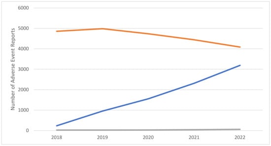 From January 2018 to December 2022, a total of 31,542 adverse event reports (AERs) involving the selected molecules were submitted to FAERS. Among these, 37.6% involved dulaglutide (n = 11,858), 26.1% semaglutide (n = 8249), 25.0% liraglutide (n = 7883), 8.2% exenatide (n = 2585), 1.24% lixisenatide (n = 390), 0.9% tirzepatide (n = 290), 0.6% phentermine–topiramate (n = 183), and 0.3% albiglutide (n = 104). Regarding semaglutide, during the selected timeframe, an increase in the number of reported AERs compared to remaining molecules was observed (Figure 1); overall, most reports came from the United States of America (USA) and involved female adults (Table 1).
