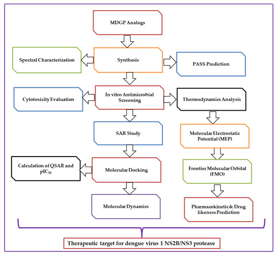 A literature survey suggested that biologically active molecules consist of aromatic ring substituents [12,13]. Benzene and its homologs, as well as nitrogen, sulfur, and halogen, act as a group and are known to enhance the biological activity of the parent molecule [14,15,16]. Moreover, it was reported that merging two active nuclei to form a molecule also increased the biological efficacy of the molecule [17,18]. The combination of two or more heteroaromatic rings and acyl groups can also increase the biological activity of the parent nucleus [19,20]. Monosaccharide derivatives have broad-spectrum antibacterial action against gram-negative and gram-positive pathogens, such as Escherichia coli, Bacillus subtilis, Salmonella typhi, and Staphylococcus aureus [21]. Monosaccharide analogs inhibited cancer cells in a recent study [22]. Isosteric changes at the hydroxyl group of nucleoside and monosaccharide structures were used to produce powerful antiviral [23,24,25] and antibacterial drugs [26]. Based on the above findings, we sought novel antimicrobial agents [27,28]. The current study aimed to synthesize a panel of (MDGP, 1) analogs (2–7) and evaluate their in vitro antimicrobial activity against eight pathogens. Additionally, the study aimed to perform molecular docking studies against dengue virus 1 NS2B/NS3 protease (3L6P) and report the prediction of activity spectra for substances (PASS). To confirm the stability of the docked complexes, molecular dynamic simulations were performed for 150 ns. Furthermore, the study focused on optimizing the synthesized (MDGP, 1) compounds and investigating their physicochemical behavior through density functional theory (DFT) studies. The overall objective of the study was to evaluate the potential of the synthesized analogs as antimicrobial and antiviral agents.