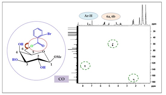 Attribution of the signals by analyzing its COSY, HSQC, and HMBC spectral experiments (Table 2 and Figure 2), along with the 13C NMR spectrum, ascertained the structure as methyl 6-O-(2-bromobenzoyl)-β-d-galactopyranoside (2).
