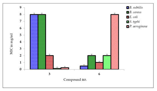 MIC values of compounds 3 and 6 against the tested organisms.