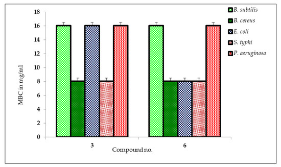 On the other hand, the results of the MBC test, which indicated the minimal antibacterial chemical concentration required to eradicate 99.9% of the test organisms from the original inoculum, are shown in Figure 4. The results of the MBC test revealed that B. cereus and S. typhi were the most susceptible bacteria to both analogs (methyl β-d-galactopyranoside compounds 3 and 6), requiring only 8.0 mg/mL to eradicate 99.9% of the test organisms from the original inoculum. On the other hand, B. subtilis, E. coli, and P. aeruginosa required 16.0 mg/mL of the analogs to achieve the same level of antibacterial activity, according to the MBC test. The findings of this study are consistent with previous studies that have demonstrated the antibacterial potential of methyl β-d-galactopyranoside analogs against various bacterial species. For example, previous studies have investigated the antibacterial activity of a series of methyl β-d-galactopyranoside analogs against methicillin-resistant S. aureus (MRSA) and found that some analogs showed potent activity against MRSA, with low MBC values [44,45]. Moreover, the antibacterial activity of a methyl β-D-galactopyranoside derivative against E. coli was studied, and the compound exhibited a dose-dependent bactericidal effect against bacteria with MBC values ranging from 0.704 to 1.408 mg/mL [27]. In conclusion, the results of this study indicate that methyl β-d-galactopyranoside compounds 3 and 6 possess antibacterial activity against a range of bacterial species, with B. cereus and S. typhi being the most susceptible strains. Further research is warranted to investigate the potential clinical applications of these analogs in treating bacterial infections in vivo using experimental animals.