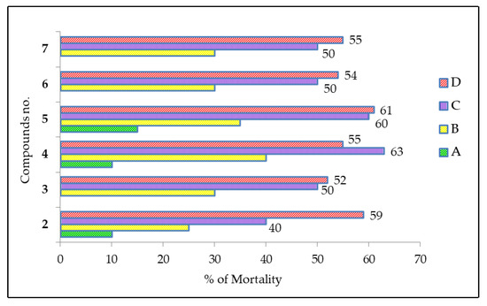 Figure 5 displays the cytotoxicity of synthesized MDGP compounds (2–7) as assessed by the brine shrimp lethality bioassay method [49]. The figure depicts the mortality percentage of shrimp at 24 and 48 h. The hydrophobicity and cytotoxicity were enhanced by long alkyl chains and phenyl rings, as reported in [44]. MDGP compound 3 (methyl 6-O-(2-bromobenzoyl)-2,3,4-tri-O-lauroyl-β-d-galactopyranoside) exhibited the least toxicity, resulting in a mortality rate of 30.09%, as per the data analysis. Compounds 4 (methyl 6-O-(2-bromobenzoyl)-2,3,4-tri-O-myristoyl-β-d-galactopyranoside) and 5 (methyl 6-O-(2-bromobenzoyl)-2,3,4-tri-O-(3-chlorobenzoyl)-β-d-galactopyranoside) exhibited the highest toxicity levels, resulting in increased mortality of 37.11% to 38.17%. This observation indicates that benzoyl derivatives exhibit lower cytotoxicity than alkyl chain derivatives. Furthermore, the cytotoxicity of alkyl chain derivatives exhibits a positive correlation with concentration.