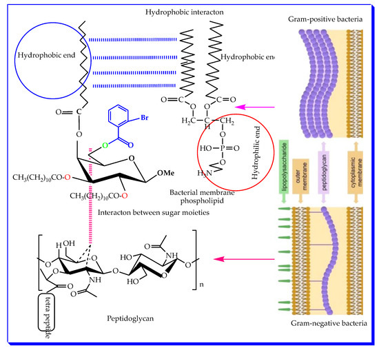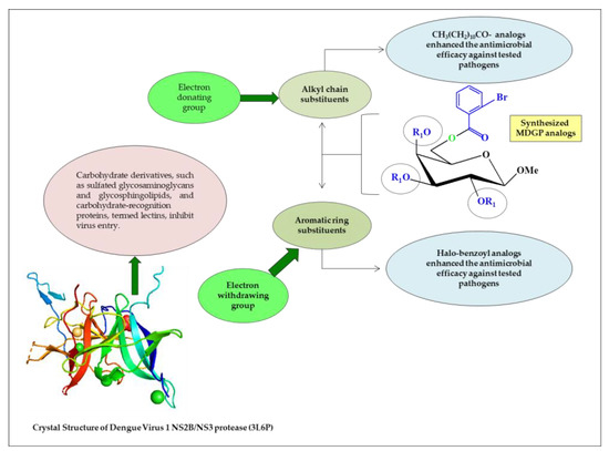 The acyl chains of MDGP accumulated in the lipid-like structure of bacterial membranes are hypothesized to engage in analogous hydrophobic interactions. Hydrophobic contact causes bacteria to lose membrane permeability, which leads to organism death. The structure–activity relationship (SAR) of the synthesized MDGP compounds was attempted based on the results. It was also shown that the antibacterial activity of MDGP (1) was enhanced by the addition of 2-Br.C6H5CO- and CH3(CH2)10CO-groups to either the C-6 position or the C-2, C-3, and C-4 positions of compounds 1 or 2 (Figure 7). In addition, a computational study of the synthesized MDGP analogs revealed promising binding affinity against the membrane and NS2B/NS3 protease. Carbohydrate derivatives resemble natural glucoside/galactoside and incorporate into DNA and RNA to facilitate cellular metabolism. Most antibiotic carbohydrate derivatives work by obstructing viral DNA or RNA polymerase during the chain extension step of replication.
