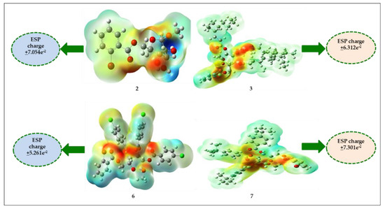 The molecular electrostatic potential (MEP) predicted reactive sites for the electrophilic and nucleophilic assault of all organic compounds [56,57]. Color-grading MEPs show molecular size, shape, and positive, negative, and neutral electrostatic potential areas. The MEP predicted electrophilic and nucleophilic reactive sites of MDGP, 1, and its derivatives (2–7). Red is the maximum negative area, which is good for electrophilic assault, blue is the maximum positive area, good for a nucleophilic attack, and green is the zero potential region (Figure 9).