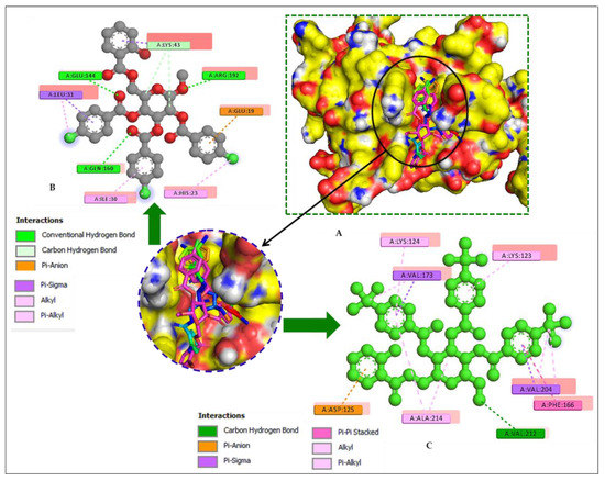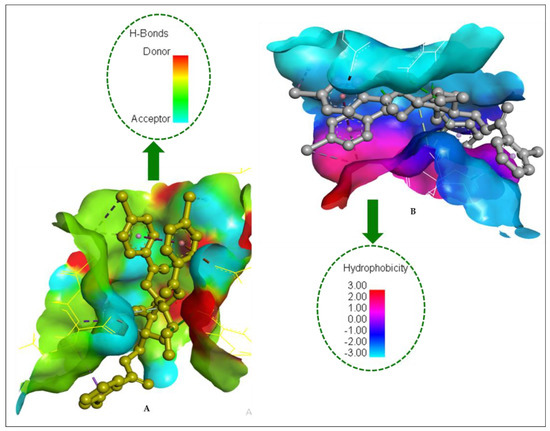 Along with Phe166, all compounds had the highest π–π interactions with Trp17, Lys43, and Lys124, indicating strong binding with the active site. Some studies imply that Phe166 is the main component of PPS and PPT that makes small molecules accessible at the active site. Due to hydrogen bonding, some compounds (5–7) have higher binding energies and modes [58]. The modifications of the -OH group in MDGP, 1 strengthened the π–π interactions with the amino acid chain at the binding site while their polarity improvement caused hydrogen bond interactions. The maximum numbers of H-bonds were observed by compounds 5 and 6 with Glu20, Glu144, Gln160, and Arg192 residues. The H-bond and hydrophobic surfaces of compound (5) with dengue virus-1 NS2B/NS3 protease are represented in Figure 9. It was observed from the docking study of all the (MDGP, 1) compounds with both targets that the molecules are generally surrounded by the abovementioned residues, suggesting that molecules may prevent the microbial activities of the target. The hydrogen bond surface and the hydrophobic bond surface of dengue virus-1 NS2B/NS3 protease with compound 5 are presented in Figure 11.
