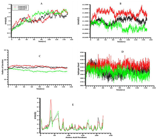A molecular-dynamics simulation examined the docked complex’s binding stability. To determine the docked complex binding rigidity, root mean square deviations from the C-alpha atoms of simulated complexes were studied. Figure 12A indicates that compounds 5, 6, and 7 had an initial upward trend, which indicates initial flexibility. All three complexes reached the stable state and did not fluctuate after 60 ns until the rest of the simulation periods, which indicated the overall stability of the complexes. The solvent-accessible surface area (SASA) of the simulated complexes was also analyzed. It is known that a higher SASA value defines higher flexibility and a lower SASA value indicates the truncated nature of the complexes. Figure 12B indicates that compound 7 possesses a reduced surface area after 60 ns upon ligand binding. The other two complexes exhibit similar binding patterns after 60 ns to the rest of the simulation time. The radius of gyration (Rg) profile of the simulated complexes defines the labile nature of the complexes, where a higher Rg value is related to a more mobile nature, whereas a lower Rg value is related to the stable conformations of the complexes. Figure 12C indicates that the three complexes have stable and steady trends in Rg and do not overfluctuate [59]. The hydrogen bond of the simulated complexes defines the stability of the drug–protein complexes, whereas all three complexes showed a steady hydrogen bond trend in the simulations (Figure 12D). The root mean square fluctuations (RMSF) of the complexes determine amino acid residue flexibility. Figure 12E shows that the complexes are stable because their maximal residues have lower RMSF.