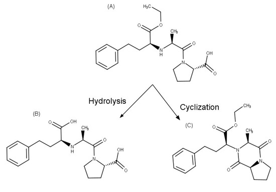 Enalapril, an inhibitor of the angiotensin-converting enzyme that is used to reduce high blood pressure and to prevent or treat heart failure. This API is degraded to enalaprilat by hydrolysis in solutions with a pH of 5 or above, while diketopiperazine is the main degradation product formed in the solid state and by photodegradation in solution (Figure 3). Zoppi et al. [35,36] investigated the effect of complex formation with βCD on the stability of this drug. Since enalapril undergoes solid-state degradation due to interaction with some excipients used in tablet formulation, the stability of this API was examined in the presence of magnesium stearate in solid state after six months of storage at 40 °C and 75% relative humidity, using an HPLC stability-indicating method. In these studies, enalapril complexed with βCD proved to be 2.1 times more stable than the drug alone in solution. In addition, enalapril cyclization, which generates enalapril diketopiperazine in the presence of excipients such as magnesium stearate in the solid state, was prevented by the complex formation with βCD, allowing a drug recovery of 95% and 82% for the complex and pure drug, respectively.