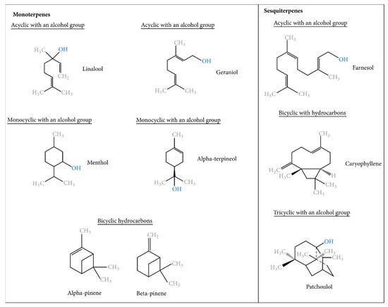 Essential oils can contain approximately up to about 300 different molecules, but most of them contain between 20 and 60 molecules. Terpene compounds constitute the majority of these molecules, but there are also phenylpropanoids as well as other compounds such as nitric and sulfuric compounds, although their frequency is lower and proportion similar. Additionally, some essential oils may also contain nitrogen and sulfur compounds [25,26,27,28].