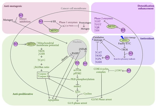Essential oils cancer preventative and anticancer mechanisms of action. EOs possess antimutagenic, antiproliferative, antioxidant, and detoxifying capabilities acting on various pathways in the cancer cell, as well as cancer preventative capabilities. EOs may directly inhibit mutagen entry into the cell. EOs can decrease phase I enzymes such as CytC, preventing mutagen formation, and increase phase II enzymes such as GST, UGT, QR, and EH for enhanced detoxification. EOs bind ROSforming reactive phenoxy radicals, which bind more ROS and increase antioxidative enzymes CAT, SOD, GPx, and GSH, thus preventing oxidative damage as a cancer preventative mechanism. EOs disrupt mitochondrial membrane potential causing an increase in ROS and decrease in GSH, release of CytC, resulting in a cascade of disruption in Bcl/Bax ratio, increase in caspase 3 and caspase 9 activity, and PARP cleavage, resulting in apoptosis. EOs suppress mTOR and pPDK1 causing PKB dephosphorylation, which dually acts to initiate caspase activity and deactivate mdm2, causing an increase in p21 to further initiate caspase activity resulting in apoptosis. Increased p21 also induces G1/S phase cell cycle arrest. EOs cause a decrease in CDK7, blocking CDK1/cyclin complex causing G2/M phase cell cycle arrest. Bax: B-cell lymphoma 2-associated X protein; Bcl-2: B-cell lymphoma 2; CAT: catalase; CDK: cyclin-dependant kinase; CytC: cytochrome C; CytP450: cytochrome P450; EH: epoxide hydrolase; EO: essential oil; ER: endoplasmic reticulum; ETC: electron transport chain; GPx: glutathione peroxidase; GSH: glutathione; GST: glutathione S-transferase; mdm2: murine double minute 2; mTOR: mechanistic target of rapamycin; MITO: mitochondria; NFκB: nuclear factor-κB; PARP: poly ADP ribose polymerase; pPDK1: protein pyruvate dehydrogenase kinase 1; PKB: protein kinase B; QT: quinone reductase; ROS: reactive oxygen species; SOD: superoxide dismutase; UGT: uridine 5′-diphospho-glucuronosyltransferase.