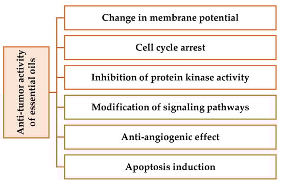 Inflammation and oxidative stress have been associated with the progression of cancer. However, they can also play a role in its development [138]. While multiple studies have shown that the anti-cancer properties of certain compounds found in EOs are associated with inflammation reduction, EOs also target various molecular pathways to inhibit and/or halt tumor cell proliferation. EOs can induce apoptosis by directly activating pro-apoptotic proteins or via signaling pathways, arrest the cell cycle directly or by inhibiting the activity of protein kinases, and modify the membrane potential of cancer cells [139,140].