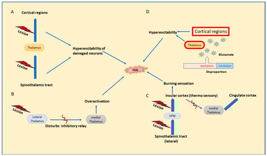 Disinhibition theory, proposed by Head and Holmes in 1911 [28], states that any lesion affecting the lateral thalamus hinders the inhibitory relay between the lateral and medial thalamus, leading to the overactivation of neurons in the medial thalamus, which results in increased pain perception [13,26,29], Figure 1B. Later, on revising the above hypothesis, thermosensory disinhibition theory states that the lesion in the lateral spinothalamic cortical projection neurons that connects to the insular cortex through the posterior ventral medial nucleus further results in the disinhibition of medial thalamic projections to cingular cortical regions [20]. Consequently, it may interfere with the cold signaling pathway in the lateral spinothalamicus and end in a burning sensation and increased responses to cold temperature; Figure 1C [6,15].
