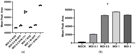 Mean peak area of GHB-NPH. Indirect detection of GHB by HSV-1-infected Vero cells (a). Samples infected with 17-Syn+, KOS, Mckrae at MOI 0.5 and 1 at 24 hpi. (b) Infected samples at MOI 0, 0.1, 0.5, 1, and 3 at 24 hpi. An (*), represents a significant statistical difference (p < 0.05) of GHB production compared (a) to samples at the same MOI and compared (b) to non-infection mock.