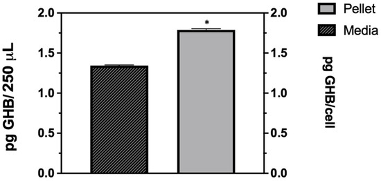 To assess the GHB release upon infection in Vero cells, GHB was measured using LC-MRM-MS, as described in Section 2.4. The results showed the release of GHB from both the media (supernatant) and cell pellet in samples infected for 24 h (Figure 2). The mean concentration of GHB in the media was 5.4 pg/mL. The mean intracellular concentration of GHB was determined to be 1.8 ± 0.02 pg/cell. Thus, 1.8 × 10−6 μg of GHB was found intracellularly compared to 3.4 × 10−7 μg in the media.