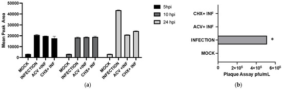 GHB production upon infection with different treatments to inhibit stages within the viral life cycle. Detection of GHB induction upon viral infection at 5, 10, 24 hpi with Acyclovir (ACV) and Cycloheximide (CHX) compared to infection and non-infection (mock). Infections were performed at MOI of 1 (a). Plaque assays were performed using lysates from infected Vero cells. Shown are the results of the untreated lysates, infection only, and treated with ACV and CHX. An asterisk (*) indicates a significant statistical difference (p < 0.05) compared to the non-infection mock sample (b).