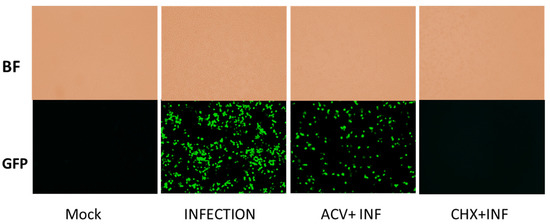 Bright field and fluorescent microscopy images for mock (non-infected) and infected samples at 24 hpi with ACV and CHX. Fluorescence microscopy records more cells with stronger green fluorescence, suggesting that ACV and CHX treatments in cells disrupted viral gene expression and replication.