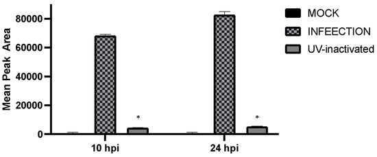 Previously, we showed that GHB release occurs as early as 5 hpi [12]. Therefore, we hypothesize that the early stages of the viral replication cycle trigger a cellular response by releasing GHB. To test this hypothesis, we performed infections using a UV-inactivated virus. The UV-inactivated viruses are capable of penetrating the cells but are incapable of progressing through the replication cycle including early-stage transcription, translation, and replication. Interestingly, the infection of cells with UV-inactivated virus did not result in significant GHB release at 10 hpi and 24 hpi compared to the regular virus (Figure 5). This suggests that the entrance of the virus into the cells alone is not sufficient for GHB production. GHB production is likely triggered by post-entry viral activities.
