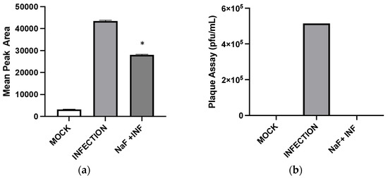GHB production upon infection with NaF inhibits glycolysis. Detection of GHB upon viral infection at 24 hpi treated with NaF, infection, and non-infection mock (a). Plaque assays were performed using lysates from infected Vero cells. Shown are the results of the untreated, infected, and NaF-infected lysates. An asterisk (*) indicates a significant statistical difference (p < 0.05) compared to the non-infection mock (b).