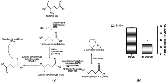 The production of GHB. (a) The pathway of GHB metabolism. (b) The glycolytic enzyme, SSADH expression was analyzed via RT-qPCR. Shown are the results of non-infection and infection. An asterisk (*) indicates a significant statistical difference (p < 0.05) compared to the expression level of other GHB metabolic pathway enzymes upon infection.