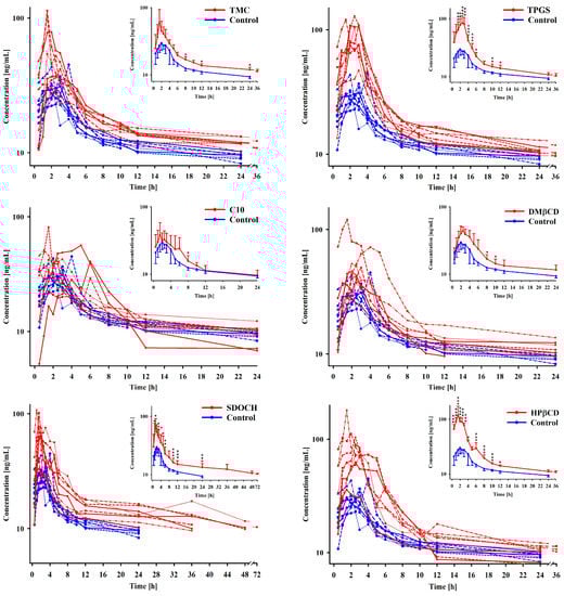 Although the SDOCH, TPGS, and HP-β-CD significantly increased the plasma drug concentrations at nearly all sampling points (Figure 1), the bioavailability, and the AUC0-t, they did not significantly influence the absorption time parameters (kab, t1/2kab, MAT) or the elimination time parameters (k1/2β, t1/2β). Also, there was no significant influence on MRT (Table 1).