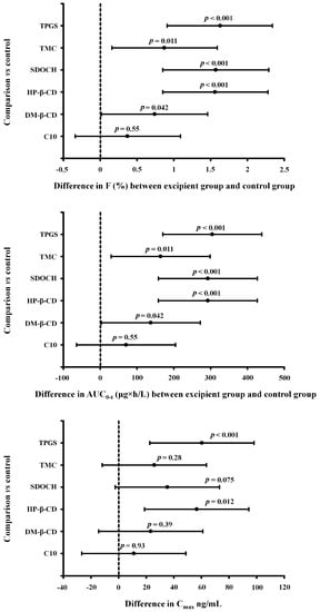 The 95% confidence intervals for the difference for bioavailability (F), area under the concentration–time curve calculated from 0 to t (AUC0→t) and maximum plasma concentrations (Cmax). C10−sodium caprate; DM−β−CD−(2,6−di−O−methyl)−β−cyclodextrin; HP−β−CD−2−hydroxypropyl)−β−cyclodextrin; SDOCH−odium desoxycholate; TMC−trimethyl chitosan; and TPGS−tocopherol polyethylene glycol 1000 succinate.