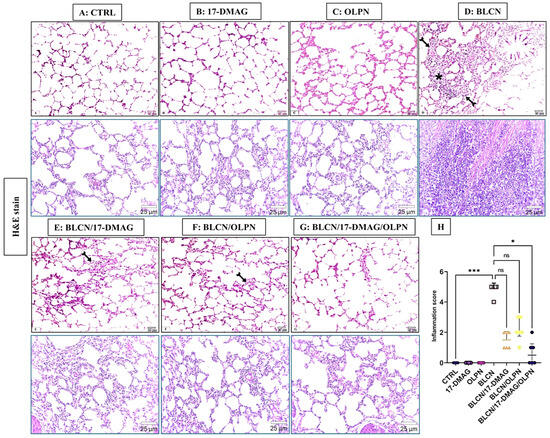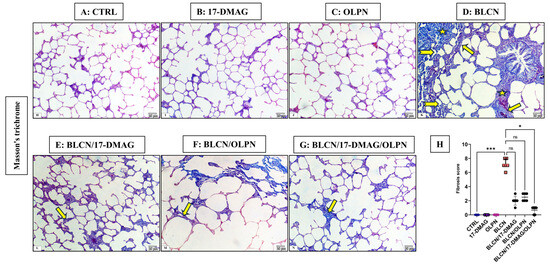 Effect of the alvespimycin, OLPN, and their combined therapy on the histological structure of the lung. Sections of CTRL (A), 17-DMAG (B), and OLPN (C), respectively, show normal lung architecture formed of thin-walled alveoli. Section of BLCN-treated rats (D) shows substantial inflammatory cellular infiltration (asterisk) and marked thickening of inter-alveolar septa (forked arrow) compared to CTRL, 17-DMAG, or OLPN rats. Lung sections from rats with pulmonary fibrosis treated with 17-DMAG (E), OLPN (F), and their combined therapy (G) reveal mild inflammatory cellular infiltration and alveolar septal thickening (forked arrows) as confirmed by the inflammation score (H). Significance is indicated by the pairwise comparisons. * p < 0.05 vs. BLCN; *** p < 0.001 vs. CTRL.