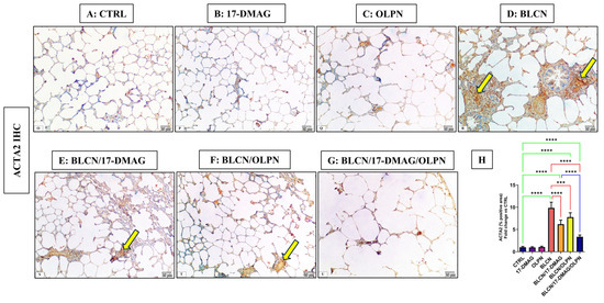 Regarding tissue expression of ACTA2, CTRL (A), 17-DMAG (B) and OLPN (C) show scant expressions in lung tissues. Sections of bleomycin-treated animals (D) show an increase in ACTA2 immune expression (arrows). Sections of rats with pulmonary fibrosis treated with 17-DMAG (E), OLPN (F), and their combined therapy (G) attained a significant reduction in tissue expression of these markers compared to bleomycin-treated animals as indicated by the improved percentage of the positive area (H). Significance is indicated by the pairwise comparisons. *** p < 0.001; **** p < 0.0001.