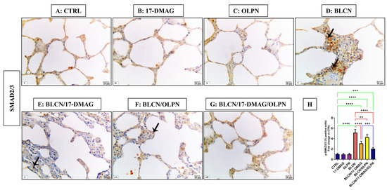 Regarding tissue expression of p-SMAD2/3, CTRL (A), 17-DMAG (B) and OLPN (C) show scant expressions in lung tissues. Sections of bleomycin-treated animals (D) show an increase in p-SMAD2/3 immune expression (arrows). Sections of rats with pulmonary fibrosis treated with 17-DMAG (E), OLPN (F), and their combined therapy (G) attained a significant reduction in tissue expression of p-SMAD2/3 compared to bleomycin-treated animals as also indicated by the decreased percentage of positive cells (H). Significance is indicated by the pairwise comparisons. ** p < 0.01; *** p < 0.001; **** p < 0.0001.
