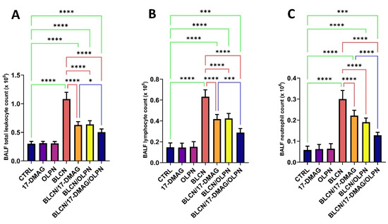 Following BLCN administration, the total leukocyte count, lymphocyte count, and neutrophil count increased significantly in the BALF (Figure 6A,B,C, respectively). However, 17-DMAG, OLPN, or their combination treatment significantly reversed the observed effect caused by BLCN exposure. When compared to the BLCN/17-DMAG group, the combined therapy resulted in a significant decrease in these levels.
