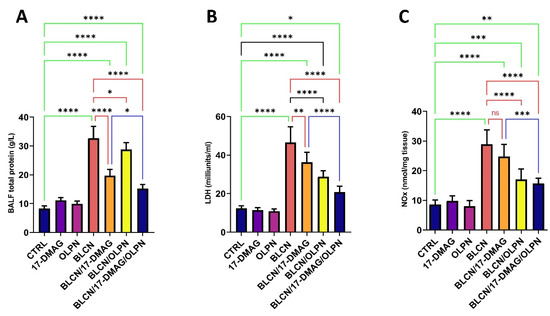 The total protein content, LDH, and NOx levels in the BALF increased significantly after BLCN administration (Figure 7A,B,C, respectively). However, 17-DMAG, OLPN, or their combination treatment significantly reversed the BLCN-induced effect. The combined therapy led to a significant decrease in these levels in comparison with the BLCN/17-DMAG group.