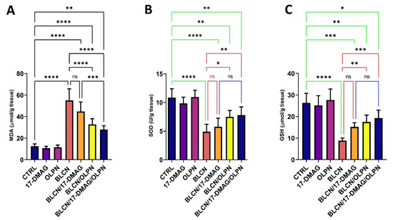 Effect of the combined therapy of alvespimycin and OLPN and their monotherapies on MDA (A); SOD (B); and GSH (C). Significance is indicated by the pairwise comparisons. * p < 0.05; ** p < 0.01; *** p < 0.001; **** p < 0.0001; ns: not significance.