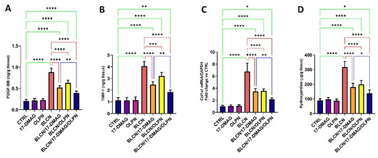 17-DMAG or OLPN treatment to BLCN-exposed rats resulted in a significant rise in PDGF-BB, TIMP-1, COL1A1 mRNA, and hydroxyproline levels (Figure 9A,B,C,D, respectively) compared with the BLCN group which demonstrated a significant rise in these levels compared to those of the CTRL group. However, these levels were reduced significantly after the treatment of BLCN-exposed rats with 17-DMAG or OLPN. On the other hand, the combined therapy resulted in a significant decrease in these levels compared to those of the BLCN/17-DMAG group.