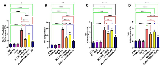 Effect of the combined therapy of alvespimycin and OLPN and their monotherapies on TGF-β mRNA (A); TGF-β (B); TβRI (C); and TβRII (D). Significance is indicated by the pairwise comparisons. * p < 0.05; ** p < 0.01; *** p < 0.001; **** p < 0.0001; ns: not significance.