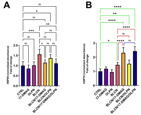 Effect of the combined therapy of alvespimycin and OLPN and their monotherapies on HSP90 (A) and HSP70 (B). Significance is indicated by the pairwise comparisons. * p < 0.05; ** p < 0.01; *** p < 0.001; **** p < 0.0001; ns: not significance.