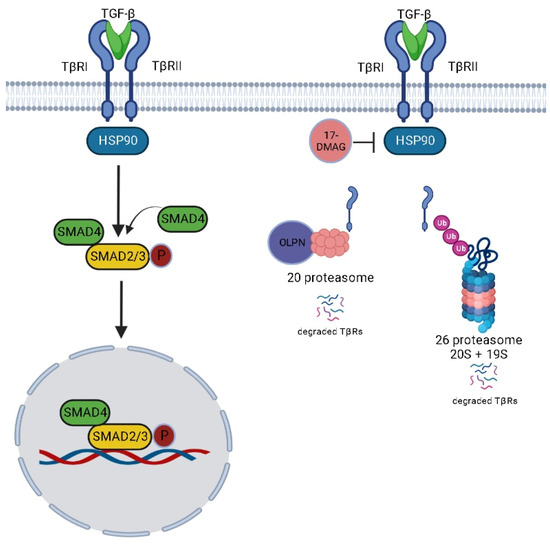 HSP90 inhibitors blocked TGF-β antiproliferative signaling. Regarding this effect, 17AAG-blocked HSP90 implicated the inhibition of TGF-β-mediated transcriptional responses by promoting TβR ubiquitination and degradation, thereby inhibiting SMAD2/3 signaling. In view of this, TβRI and TβRII are clients of HSP90 and interact particularly with this cellular chaperone [25]. This interaction accounts for the use of HSP90 inhibitors to counterbalance the unwanted activation of TGF-β signaling.