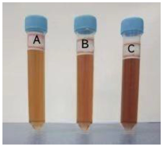 Effect pictures of appearance quality of purified acanthopanax senticosus injection, acanthopanax senticosus injection, and acanthopanax senticosus injection containing macromolecule compounds. Note: (A) Purified acanthopanax senticosus injection; (B) Original solution of acanthopanax senticosus injection; (C) Acanthopanax senticosus containing macromolecules.