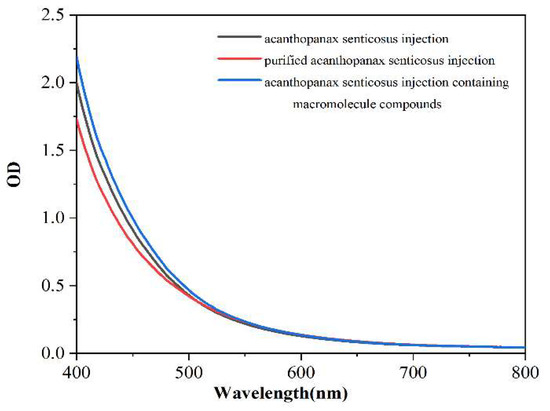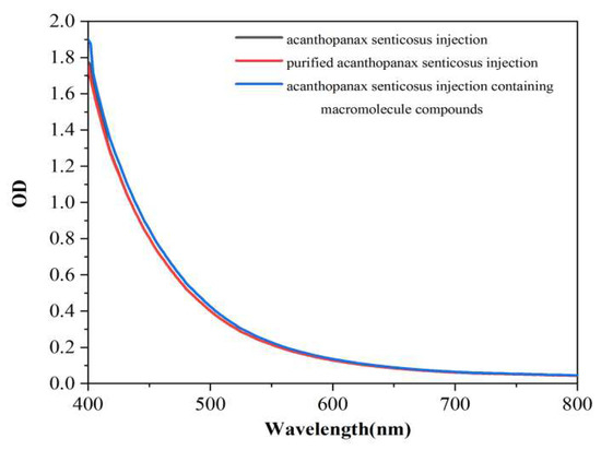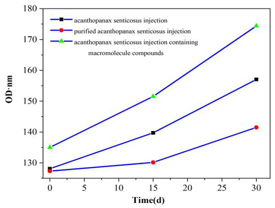 A 10 mL purified acanthopanax senticosus injection, 10 mL acanthopanax senticosus injection containing macromolecules, and 10 mL acanthopanax senticosus injection were placed in a sterile test tube with a lid and placed in a 60 °C for different times. The above samples were taken out at 50 μL per time on the first day, the 15th day, and the 30th day and added into the transparent 384 well plate. The area under the absorption curve from the enzyme standard instrument determined the overall change of the sample color. The absorption value at each wavelength for the absorption curve was summed to obtain the area under the absorption spectrum curve, and the unit was OD nm.
