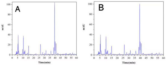 Fingerprints of acanthopanax senticosus injection and purified acanthopanax senticosus injection. Note: (A) Fingerprint of the original solution of acanthopanax senticosus injection; (B) Fingerprint of purified acanthopanax senticosus injection.