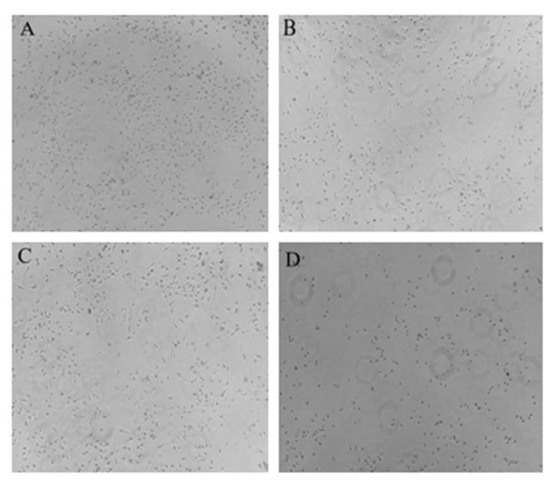 Inhibitory effect of different samples on RBL-2H3 cells. Note: (A–D) were the blank group, purified acanthopanax senticosus injection group, original solution of acanthopanax senticosus injection group, and acanthopanax senticosus injection containing macromolecules group, respectively.