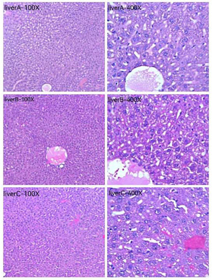 HE staining photos of mice livers using HE staining (100×, 400×). Note: (A–C) were a blank group, original solution of acanthopanax senticosus injection, and acanthopanax senticosus injection containing macromolecules, respectively.
