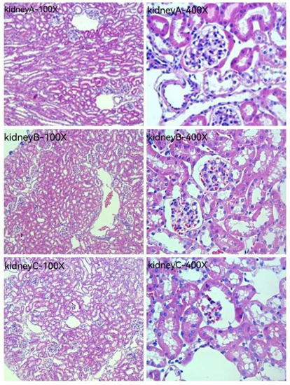 The pathological observation of mice kidneys by HE staining (100×, 400×). Note: (A–C) were the blank group, original solution of acanthopanax senticosus injection, acanthopanax senticosus injection containing macromolecules, respectively.