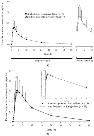 Plasma concentration–time curve. (A) After administration of a single dose (black square) and multiple doses (white square) of fexuprazan 10 mg. (B) After administration of four fexuprazan 10mg tablets (T1, black square) and one fexuprazan 40 mg tablet (T2, white circle).