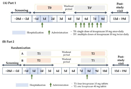 This study included two parts (Figure 3). Part 1 followed an open-label, single- or multiple-dose, 1-sequence, and 2-period design and aimed to evaluate the PKs of the single-dose and multiple-dose oral administration of fexuprazan 10 mg tablets in healthy participants. It involved eight participants and aimed to explore their PK characteristics after single- and multiple-dose fexuprazan 10 mg administration. The number of participants was determined based on the ascending dose cohort in the first-in-human study on fexuprazan [20]. The participants were admitted to the clinical trial center a day before the first administration and were instructed to keep fasting state for at least 10 h prior. The next day (1d), at around 9 am, the participants received a single dose of fexuprazan 10 mg (T0) with 150 mL of water, and blood samples (6 mL) were collected at various time points, including pre-dosing (0 h) and post-dosing (after 0.5, 1, 1.5, 2, 2.5, 3, 4, 6, 8, 12, 24, and 48 h). After a 4-day washout period, the participants visited the clinical trial center and were administered multiple doses of fexuprazan 10 mg twice daily (T0′) with 150 mL of water at approximately 9 am and 9 pm for 4 days (D5–7: approximately 9 am and 9 pm; D8: approximately 9 am). Upon reaching a steady state (D8), blood sampling was conducted at the same time points as in Period 1, up to 12 h, to determine the area under the concentration–time curve (AUC) from time zero to the end of the dosing interval.