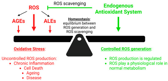 Balance between endogenous antioxidant systems and production of ROS and their by-products. Created with Biorender.com, accessed on 4th June 2023.