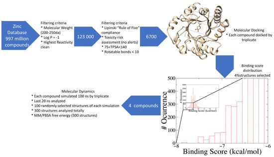 To perform the virtual screening, the SaDHQD crystal structure (PDBID: 1SFJ, chain A) was used as a receptor []. The structure was prepared by removing the crystallographic ligand 3-dehydroquinate, and energy was minimized with 100 steps using the steepest descent method and 10 steps using conjugate gradient as implemented in Chimera UCSF []. Compounds were processed with Openbabel 3.1.1 [] to convert the SDF library to individual pdb files, and then each pdb file was converted to a pdbqt file using prepare_ligand4.py as distributed on MGLTools 1.5.7 []. Molecular docking was performed using Autodock Vina []. The crystallographic ligand was used as the center of the grid box (104.40, −17.89, −107.70) with a size of 15 × 15 × 15 Å3. To validate docking results, a crystallographic ligand was redocked, obtaining an RMSD value of 2.35 ± 0.00 Å. To consider a correct molecular docking study, the RMSD between the crystallographic and the redocked ligand must be lower than 2 Å. Our study had a higher RMSD value, but it is important to point out that we are not doing covalent docking, which is the case for 3-dehydroquinate. Nonetheless, the number and type of interactions found on the crystal and the redocked ligand remain at 82%. Only three interactions were missing on the redocked 3-dehydroquinate (Thr68, Asp102, and Ser131). Three independent docking experiments were made on each ligand (6700 × 3), and all outputs were clustered by binding score. Ligands with a binding score lower than the average minus two standard deviations (4% of the normal distribution) were selected for molecular dynamics simulations (Figure 1).