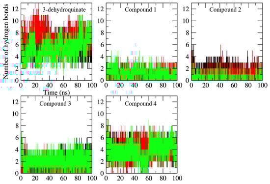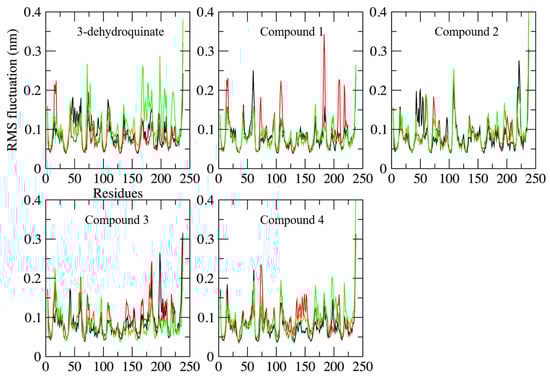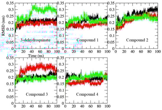 At this moment, we have a set of possible compounds that might bind to SaDHQD. However, those ligands were selected using molecular docking that does not include sidechain and/or protein conformational changes that may influence the ligand’s binding to the enzyme []. To gain more information about the enzyme-ligand interaction, three independent 100 ns molecular dynamics simulations were conducted on each system, including the crystallographic ligand (3-dehydroquinate) (Figure 2). With the aim of performing the analysis on the period when the simulations were stable over time, the last 20 ns were used for the analysis of each trajectory. Results show that the α-carbon Root Mean Square Deviation (RMSD) for most of the systems simulated was stable along the last 20 ns, but there were a couple of systems where RMSD fluctuations indicate that they may not be stable or higher than the other replicas. However, fluctuations observed for those systems were lower than 3.5 Å when compared to all systems; in fact, all systems had a RMSD variation against the initial of no more than 3.5 Å (see, for example, the green line on the 3-dehydroquinate complex and compare it with the red line from compound 4 on Figure 2); therefore, those trajectories were included and analyzed.