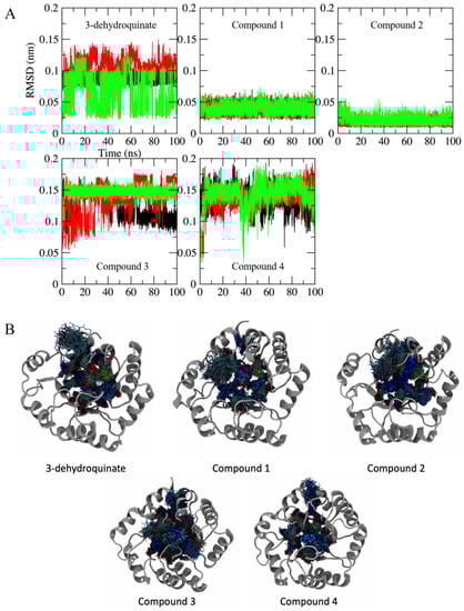 Ligand-RMSD. (A) RMSD along the 100 ns of simulated time in each complex. Replicates and axes labels are shown as described in Figure 2. (B) Ligand movement (brighter atoms at the center of each image) on the binding site (darker atoms on each image) in SaDHQD during the last 20 ns. The image also shows the movement of the lateral chains from the amino acids in the binding site.