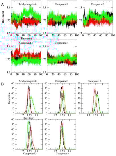 This is in consonance with data obtained from Radius of Gyration (RoG) plots. RoG is a quantity that can be related to the natural protein “breathing”. A high value of RoG might be an indication of a possible denaturation of the protein; the opposite might be related to a compaction of the protein. Initial RoG was 1.72 ± 0.003 nm. RoG values over time show fluctuations with increments above 1.8 nm. These fluctuations might indicate that the protein had an opening that can be related to the natural movement of the amino or carboxyl terminal. However, RoG distributions show that (even in the worst case: 3-dehydroquinate simulation in green), these values are located around 1.76 and 1.77 nm. These values show an increment of 0.4 Å when compared to the initial value. Therefore, no effect was observed in the compactness of the protein structure, i.e., the binding of the compounds did not generate a crucial conformational change (Figure 5).