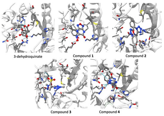 Nowadays, only a few covalent (irreversible) inhibitors of SaDHQD have been reported []. Noncovalent (reversible) inhibitors of DHQD have been reported only from other bacteria such as C. difficile and E. faecalis [,]. With the aim of obtaining the first potential noncovalent inhibitors from SaDHQD, a computer-aided drug design protocol was implemented (Figure 1). By the time the ZINC database was consulted, 997 million compounds were included in the TRANCHES 3D section. The first filtering criteria was to select structures with physicochemical characteristics similar to those of the substrate of the enzyme (3-dehydroquinate, MW = 198 Da and Log p = −1.7), therefore, compounds with a MW in the range of 200–250 Da, and a Log p value of −1 were included. Additionally, the highest reactivity clean criteria (without reactive groups) were applied, keeping only 123,000 molecules. Thereafter, Lipinski’s rule of five compliance, toxicity risk assessment, Topological Surface Area (TPSA), and rotatable bond filters were applied, leaving a final set of 6700 compounds. Nowadays, a lot of works using different virtual screening protocols to filter large chemical libraries have been published, but the challenge is always to select the best candidates for further experimental studies []. In this context, approximations such as consensus docking or rescoring functions have been used []. Here, with the aim to select molecules that potentially recognize the catalytic site of SaDHQD and to ensure that each result was consistent, three independent virtual screening assays over the same database (6700 compounds) were conducted using Autodock Vina (Table S1). It is important to mention that stereoisomers from compounds with chiral centers in their structure were included. The goal of this was to use molecular docking to find the compounds with the best binding pose according to their docking score for further computational characterization, not to perform binding free energy determinations []. The data show that four compounds met the requirement: ZINC000005753647 (1), ZINC000001720488 (2), ZINC000082049768 (3), and ZINC000644149506 (4) (Table 1).